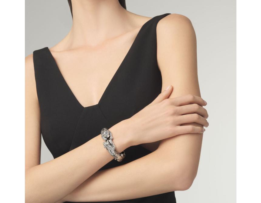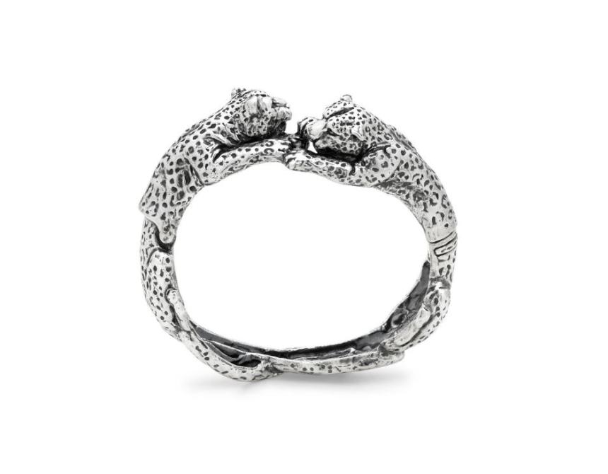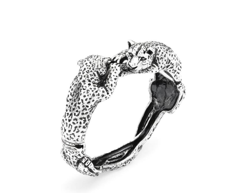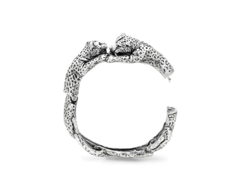 Two leopards, lying languidly opposite each other, bring life to this lost-wax cast silver bracelet with sculptural volumes. Its ability to blend elegance with the force of nature makes it iconic. The burnishing emphasises the texture of the feline's coat in a perfect combination of form and luminosity. Handmade in-house.