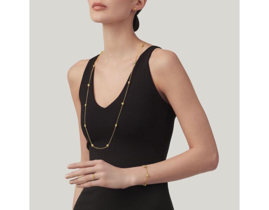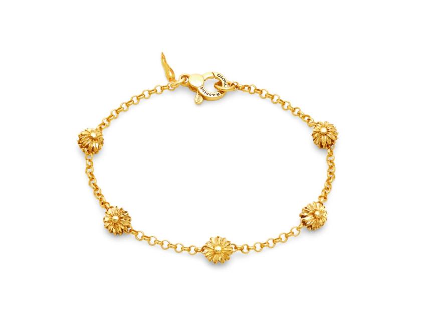 Giovanni Raspini's naturalistic design takes on a small and minimalist form. The cast silver daisies, made up of individual diamond-dressed petals, which are then gold-plated, delicately embrace the mini-rolò chain bracelet, also made from gold-plated silver. The very essence of light. Details 18 k Gold-plated sterling silver Length 20 cm Lobster clasp closure Handmade in Italy