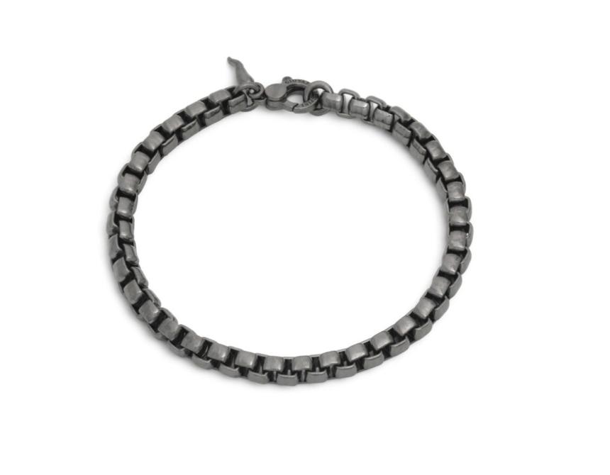 To create this distinctly contemporary silver bracelet, Giovanni Raspini revisited and transformed the timeless box chain with a black rhodium finish. This technique gives the sterling silver a deep and intense lustre, creating an extraordinary metallic black effect. Sterling Silver Length 19 cm (M) Lobster clasp closure Handmade in Italy