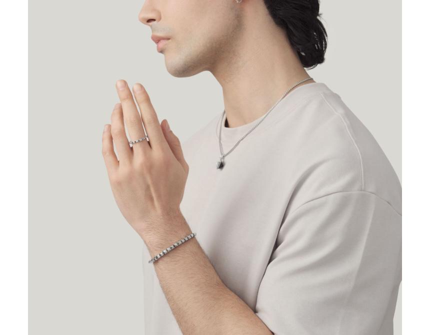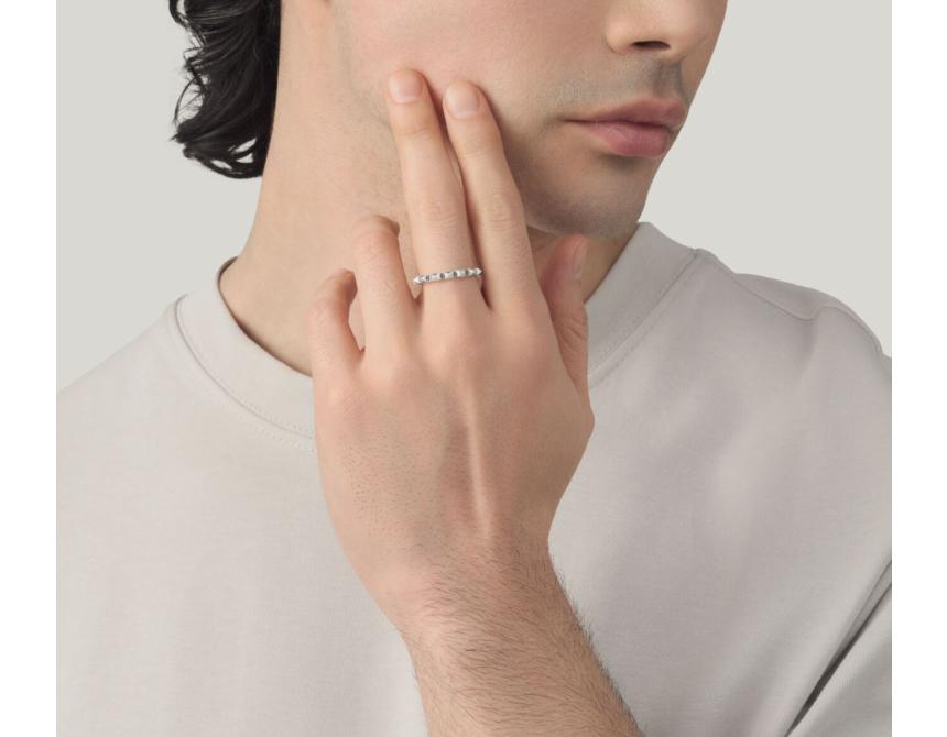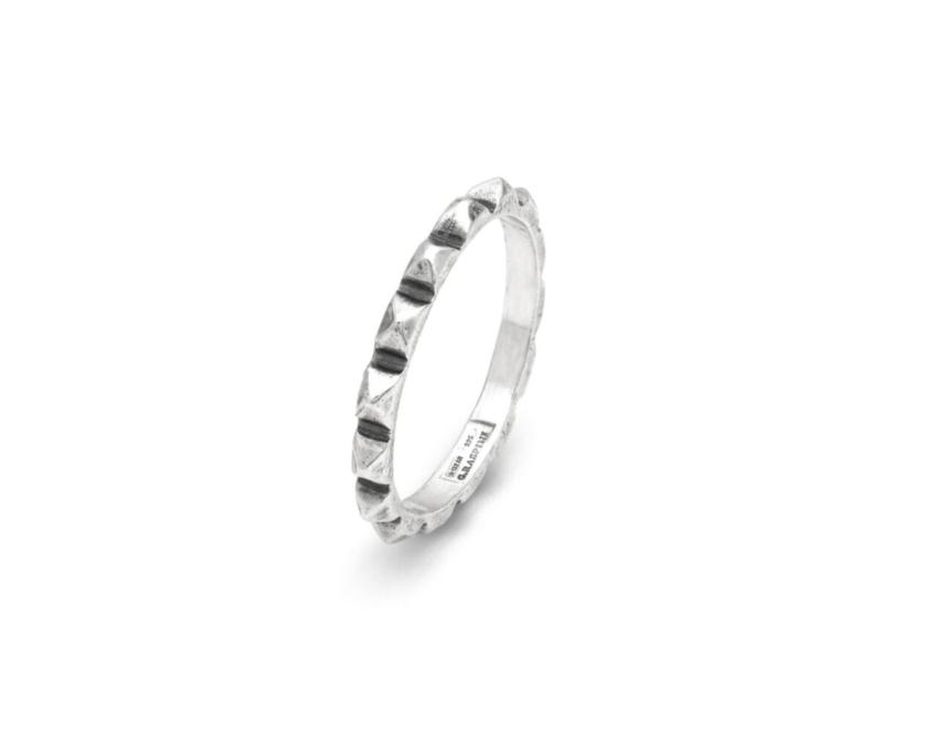 A lightweight band made from cast and burnished silver, finished with many small shiny studs. The pyramid-shaped decorations give this ring a contemporary edge: perfect for practical yet bold masculine looks. Handmade in-house.